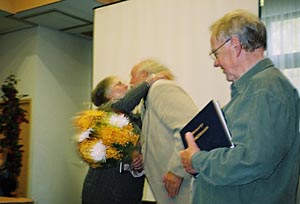 Louis le Roy en zijn vrouwe Inge krijgen uit handen van Jurrit Bergsma het eerste exemplaar van het boek "Retourtje Mondriaan" overhandigd