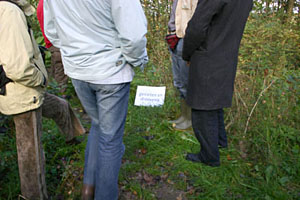 Deelnemers rond één van de papieren met daarop trefwoorden.