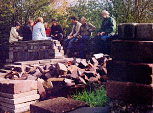 Even bijpraten op een toren van stoeptegels en bakstenen