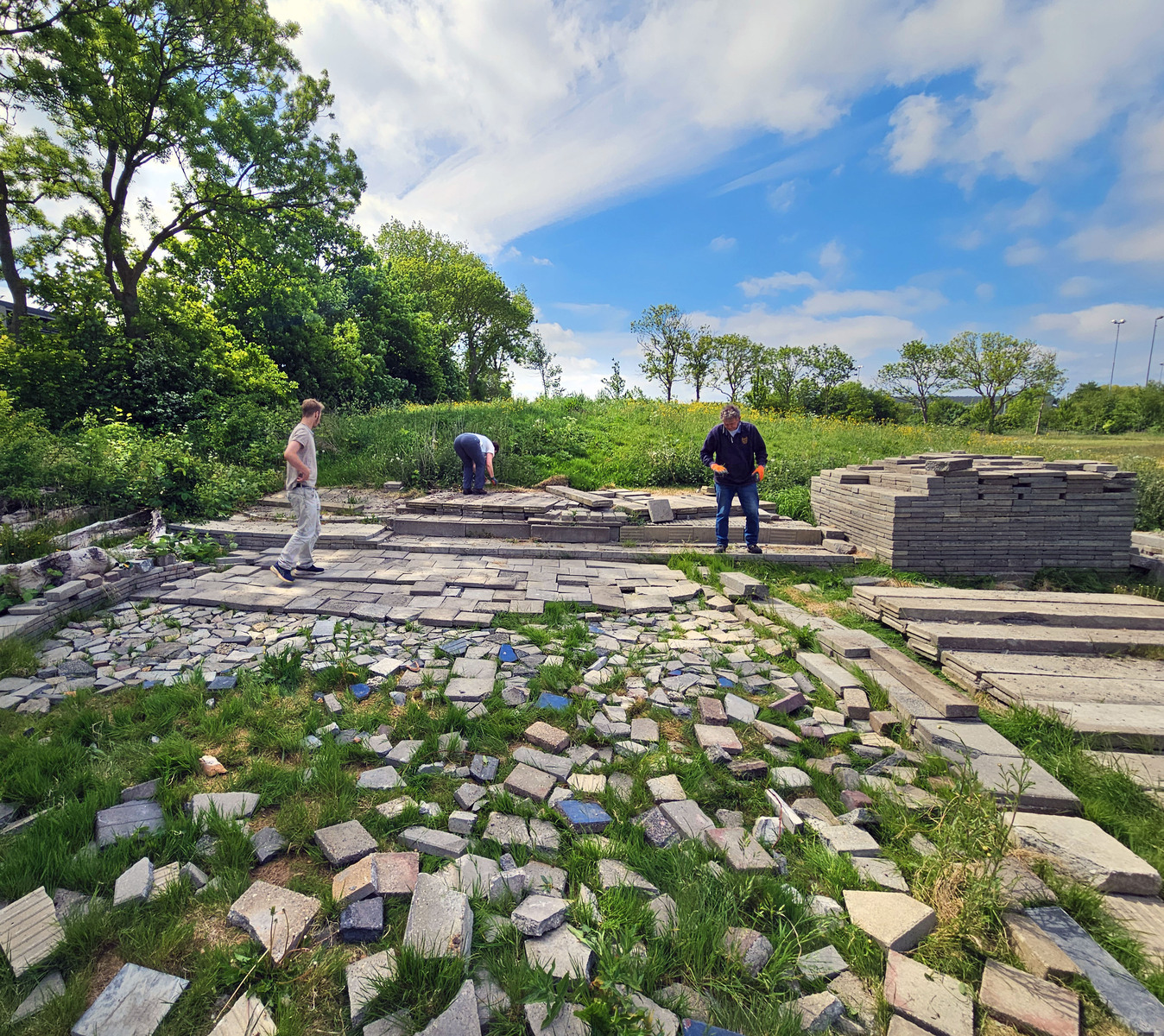 De kathedralenbouwers van de Le Roy-tuin, Willem, Antonie en Peter, waren 14 mei 02025 weer aan het werk in het Balklandpark in Harlingen, samen met Janneke Smitstra van de Stichting Ecologisch Stadspark Harlingen.